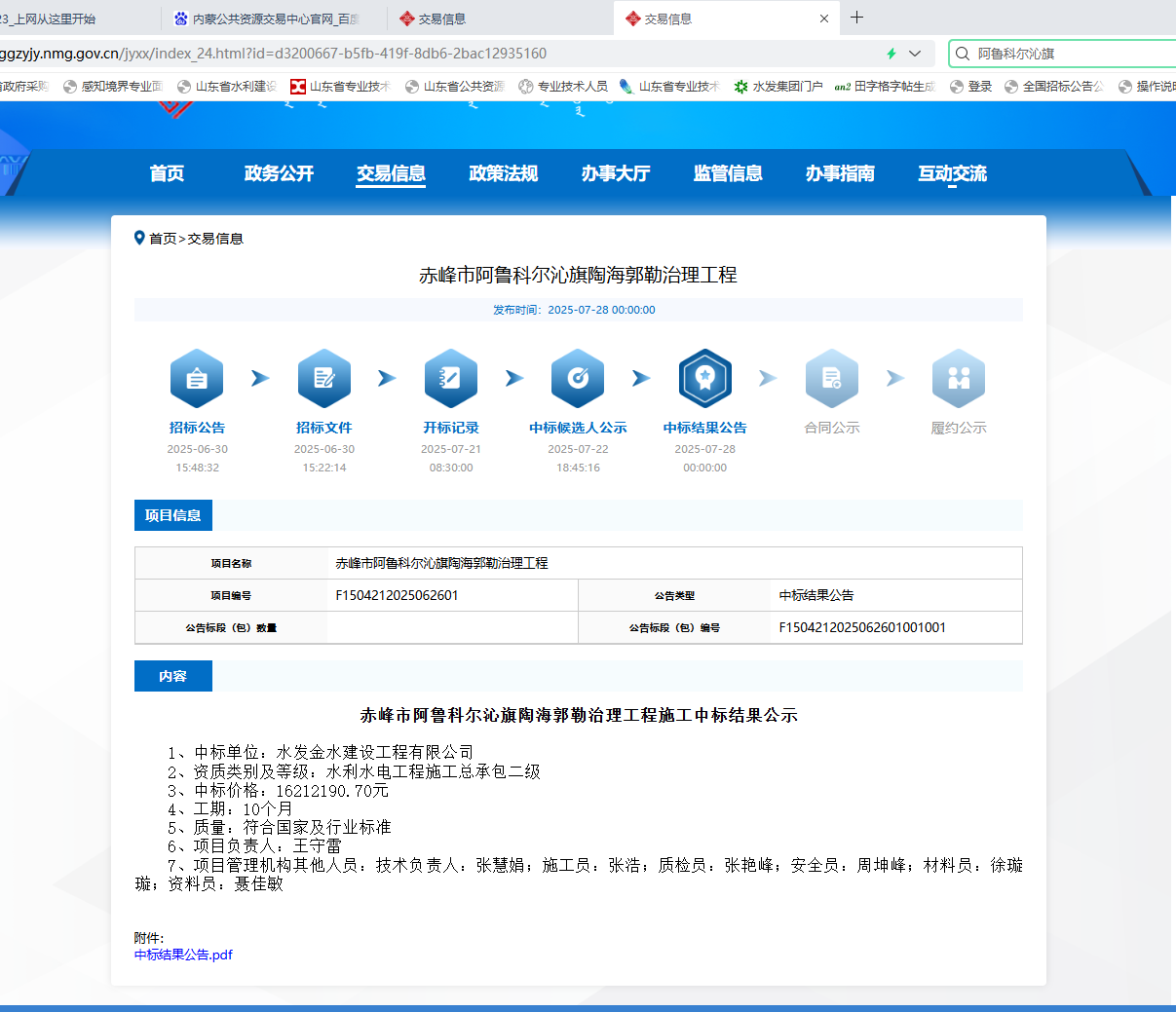 近日,内蒙古赤峰市阿鲁科尔沁旗陶海郭勒治理工程施工项目招标结果揭晓,水发金水建设工程有限公司成功中标。